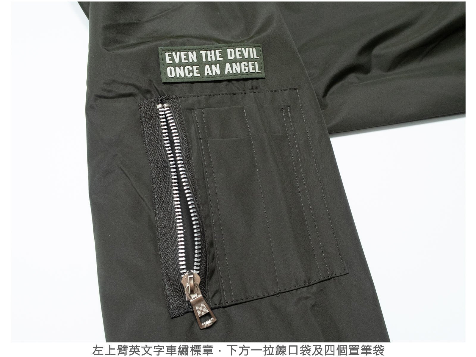 左上臂英文字車繡標章,下方一拉鍊口袋及四個置筆袋。