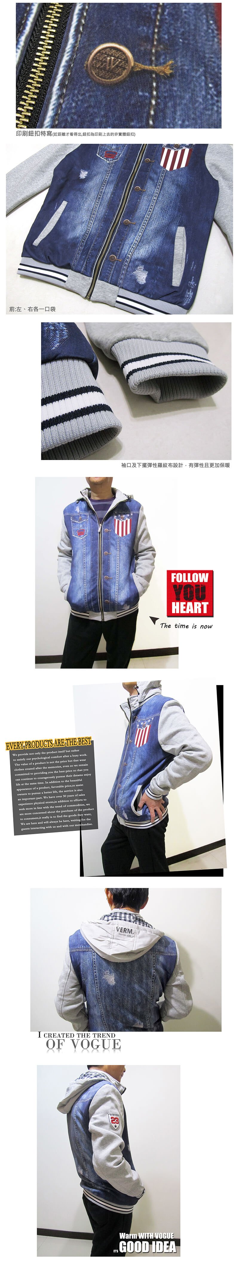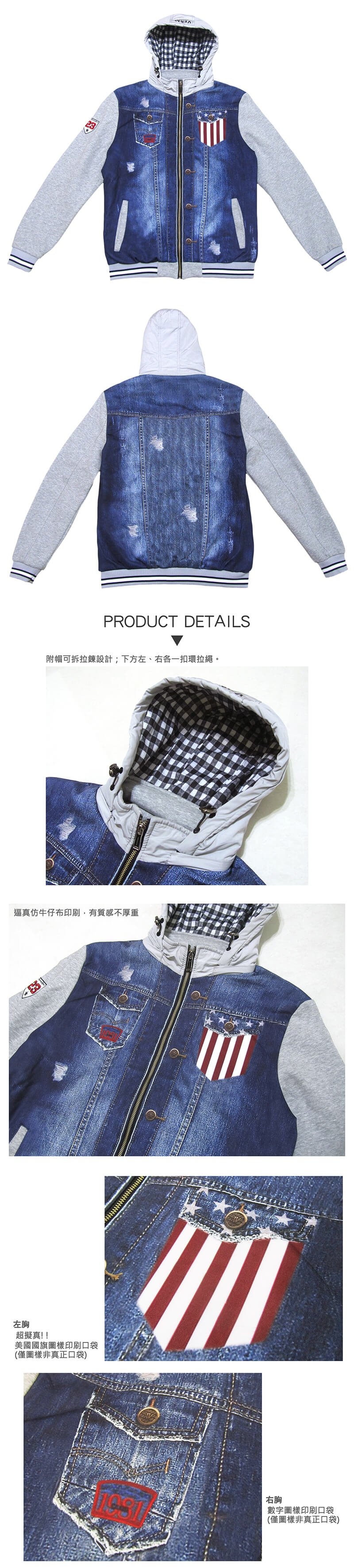 sun-e仿牛仔布擬真印刷保暖連帽厚外套、夾克外套、全棉100%外套、立體印刷外套、仿牛仔外套、騎士外套、擋風外套、防寒外套、休閒外套、保暖外套、仿丹寧外套、美國國旗(312-1808-22)牛仔色 胸圍:46英吋 [實體店面保障]
