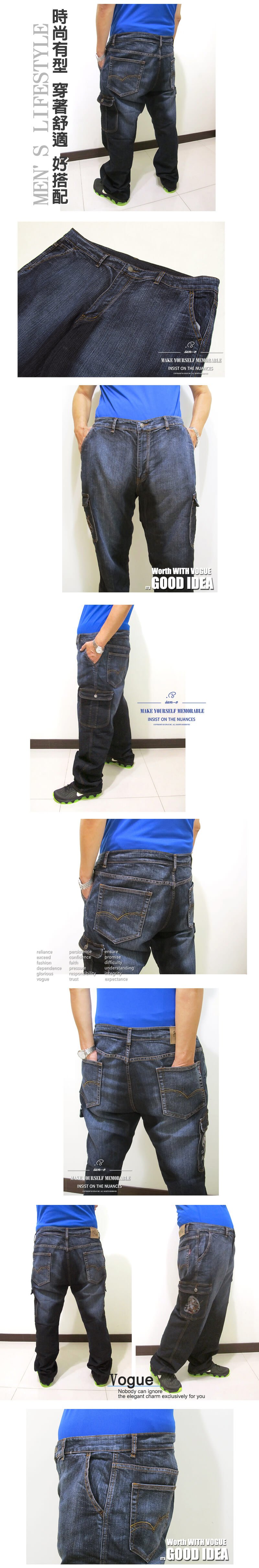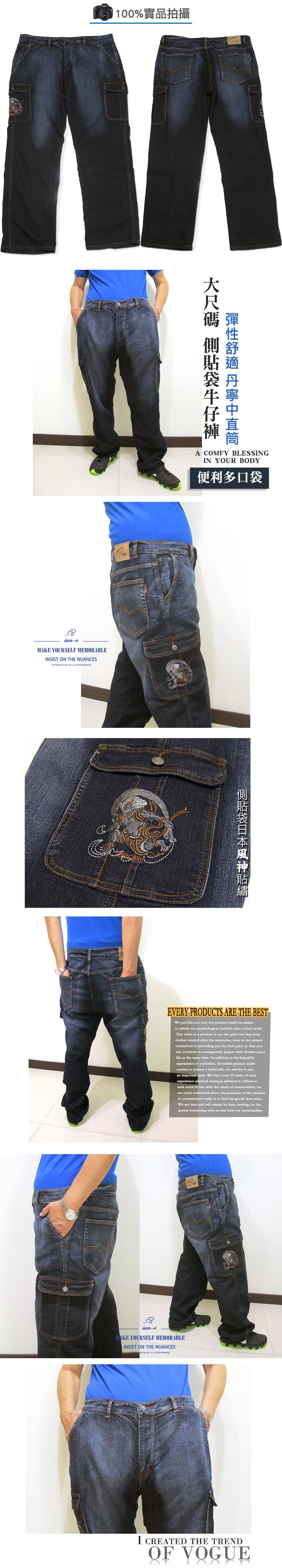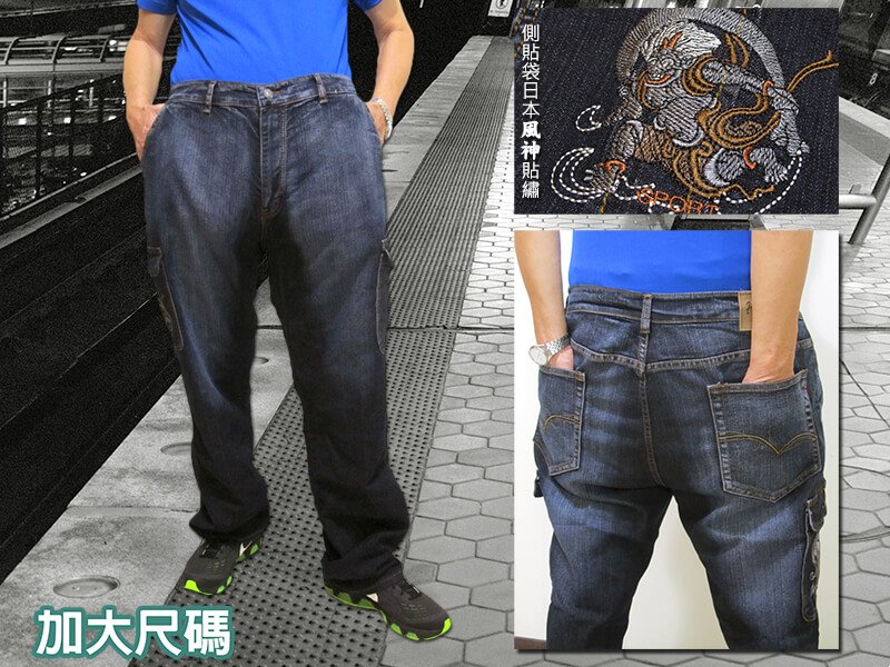 sun-e加大尺碼側貼袋牛仔長褲、大尺碼中直筒牛仔褲、大尺碼牛仔褲、大尺碼工作褲、日本風神繡圖丹寧、大尺碼單寧、彈性牛仔褲、休閒牛仔褲、多口袋牛仔褲、大尺碼褲子、深色牛仔褲、腰圍有皮帶環(褲耳)、褲檔有拉鍊(307-7152-21)深牛仔 腰圍:42 44 46 48 50(英吋) [實體店面保障]