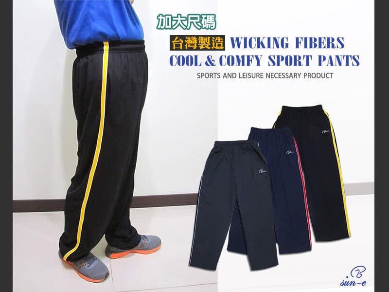 sun-e加大尺碼台灣製造吸濕排汗運動長褲、透氣排汗輕盈寬鬆長褲、亮眼配色滾邊加大尺碼休閒長褲、腰圍鬆緊吸濕排汗褲、吸濕排汗纖維、平口褲管、褲管無束口、深藍色長褲、黑色長褲、灰色長褲(310-7337-08)深藍色(310-7337-21)黑色(310-7337-22)灰色 腰圍:L XL(28~40英吋)