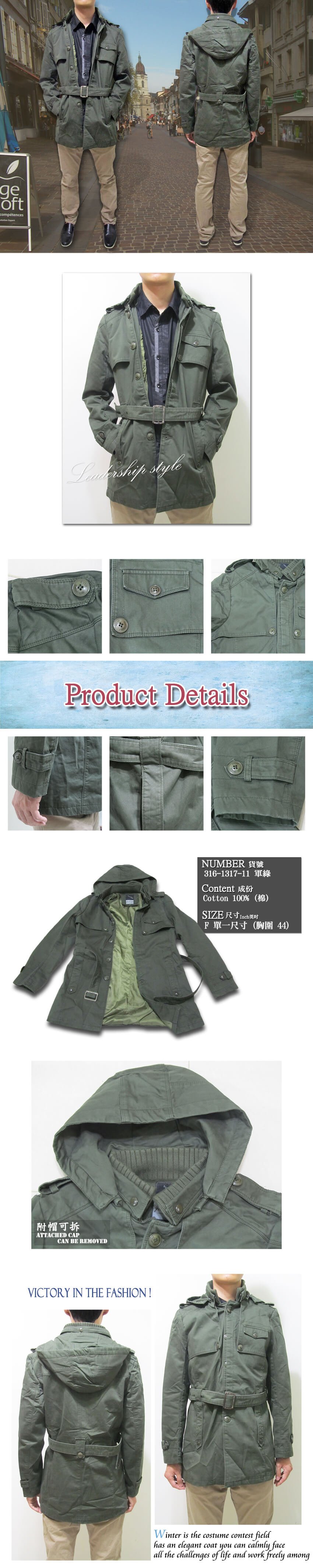 sun-e英倫風長版大衣、保暖外套、軍裝外套、連帽大衣外套、全棉100%外套、風衣外套、潮流綠大衣(316-1317-11)軍綠色 胸圍:44英吋 [實體店面保障]