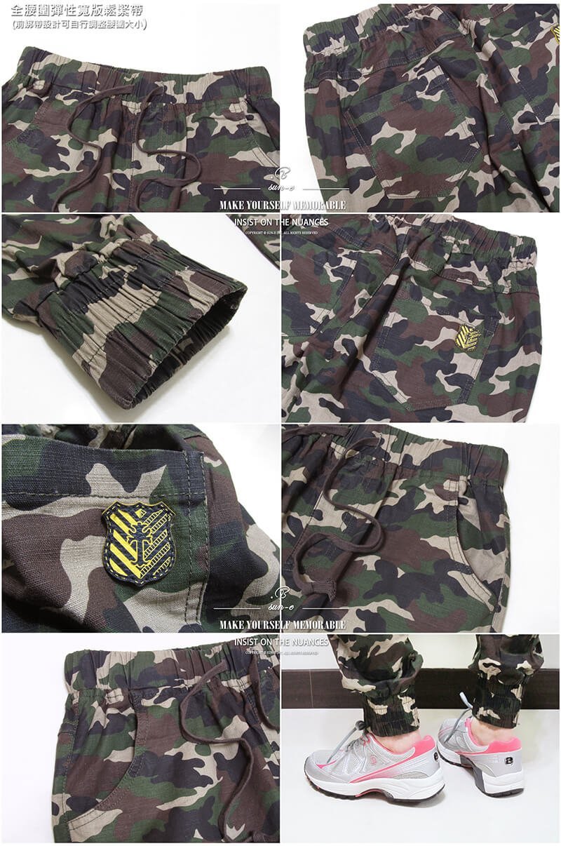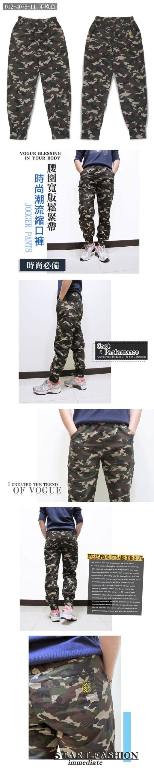 sun-e迷彩JOGGER PANTS、迷彩縮腳褲、縮口褲、束腳褲、美式休閒潮流縮口褲、慢跑褲、褲管束腳、迷彩休閒褲、JOGGERS、抽繩束口褲、休閒長褲、腰圍寬版鬆緊帶(012-4078-11)軍綠色 尺寸S M L XL(腰圍:26~33英吋) (男女可穿)[實體店面保障]